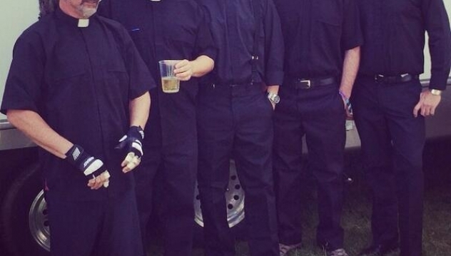 A bonus picture of them adorned in the Catholic priest garb they wore onstage is also available: