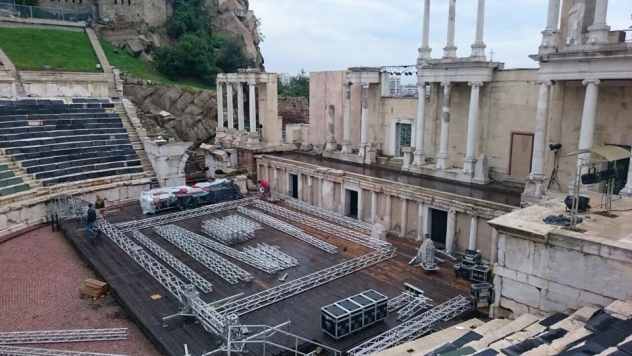 Два дни преди концерта на 2CELLOS в Пловдив тази събота, строежът на сцената започна рано тази сутрин от компания THC.